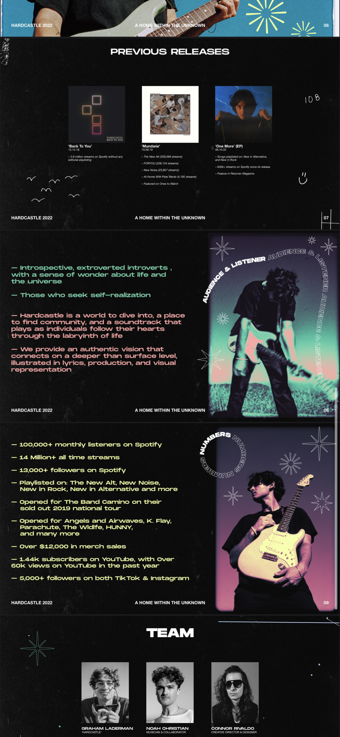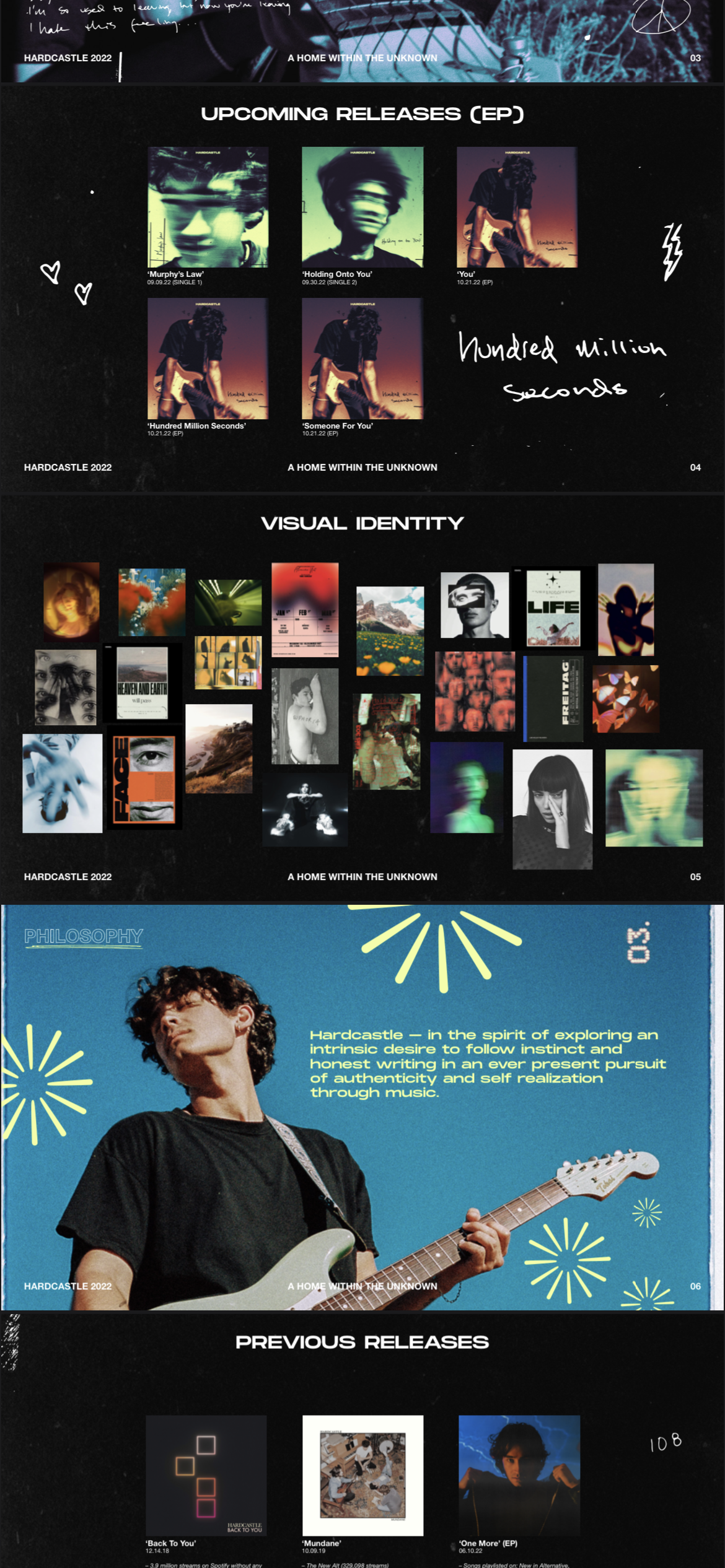 BEGINNING A NEW ERA FOR THE ARTIST, CONNOR WORKED DIRECTLY WITH HARDCASTLE TO BUILD OUT A NEW BRAND IDENTITY AND VISUAL FOUNDATION FOR FUTURE PROJECTS. STARTING WITH THE ROLLOUT OF THE ‘HUNDRED MILLION SECONDS EP, CONNOR EXECUTED VARIOUS PROMOTIONAL GRAPHICS IN ADDITION TO THE EP AND SINGLE COVERS, ALONG WITH AN INTERNAL DECK PRESENTATION.